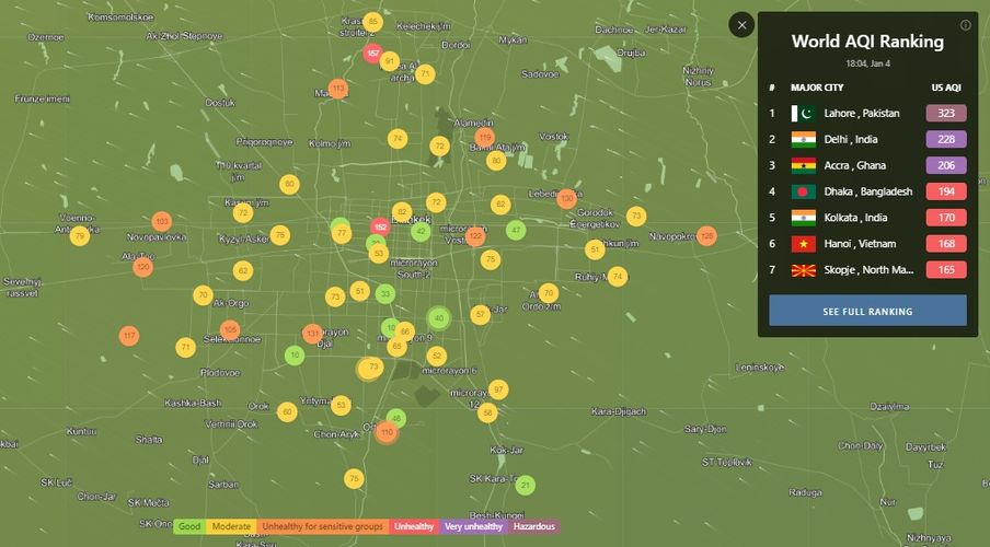 Индекс качества воздуха (AQI) разделен на шесть категорий, указывающих на возрастающий уровень опасности для здоровья. Значение AQI выше 300 — это опасное качество воздуха, а значение ниже 50 — хорошее.