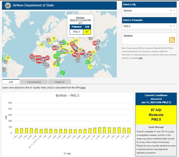 Посольство США в Кыргызстане также установило станцию. Информация обновляется каждый час. Индекс качества воздуха в районе дипломатической миссии «умеренный» — 87 (AQI).