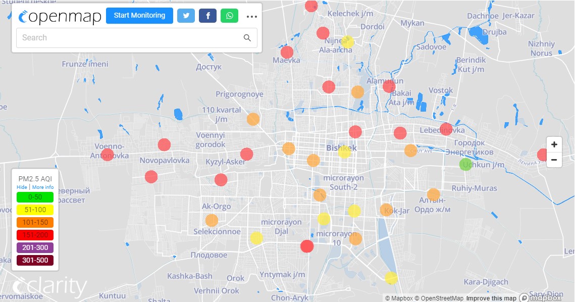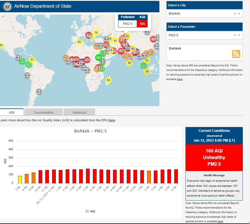 Посольство США в Кыргызстане также установило станцию. Информация обновляется каждый час. Индекс качества воздуха в районе дипломатической миссии «нездоровый» — 165 (AQI).