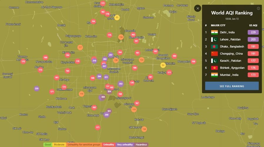 В 18.00 статус города отмечен как «нездоровый». Индекс качества воздуха, по данным сайта, составляет 176 (AQI).