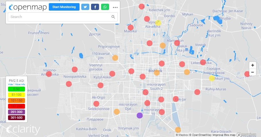Посольство США в Кыргызстане также установило станцию. Информация обновляется каждый час. Индекс качества воздуха в районе дипломатической миссии «очень нездоровый» — 262 (AQI).