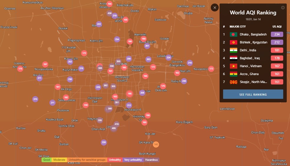 В рейтинге крупнейших городов мира по качеству воздуха World Air Quality Бишкек находится на 2-м месте.