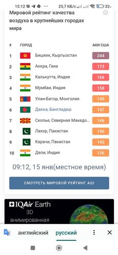 В рейтинге крупнейших городов мира по качеству воздуха World Air Quality Бишкек сегодня вновь на первом месте.