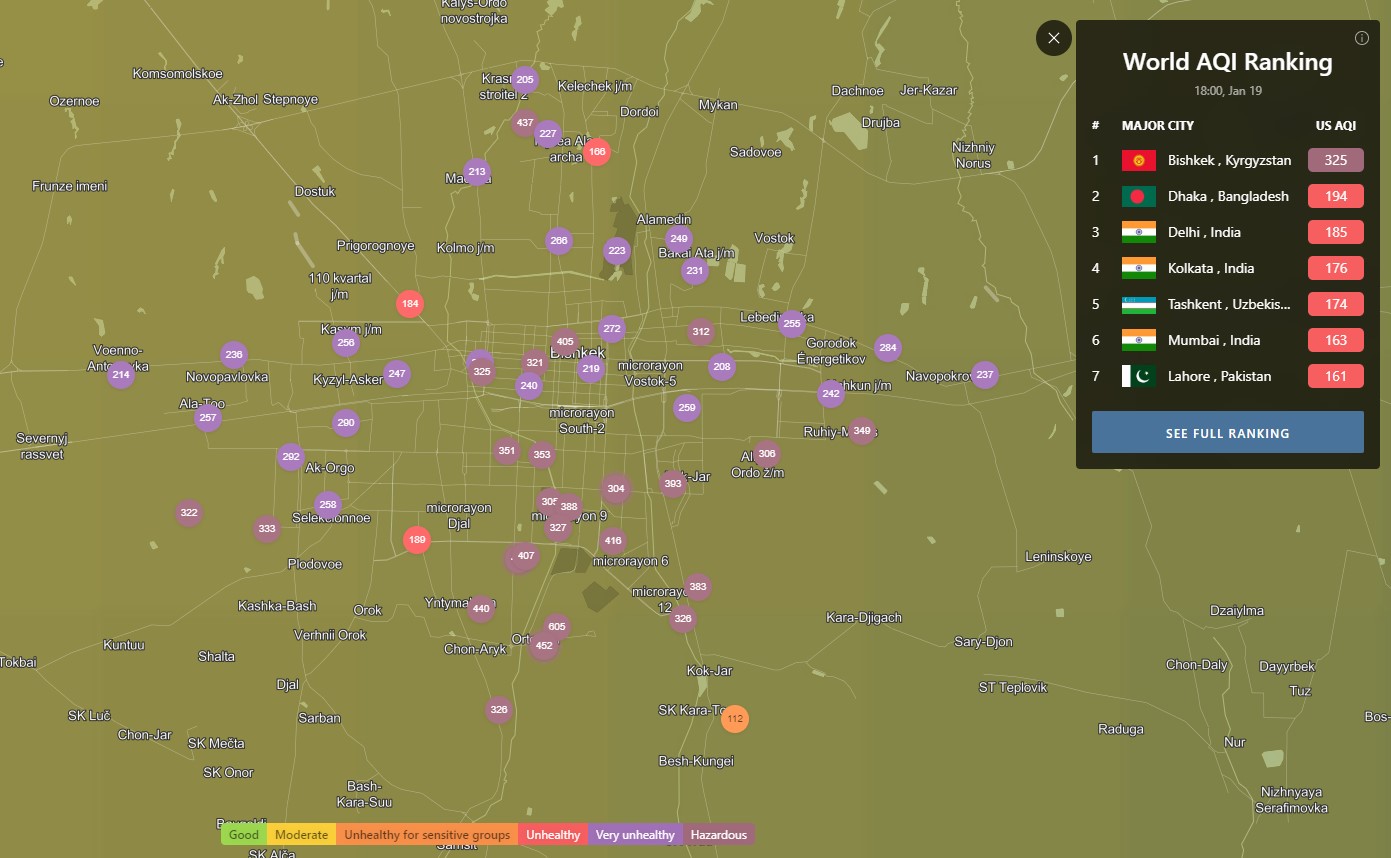 В рейтинге крупнейших городов мира по качеству воздуха World Air Quality Бишкек вновь занял первое место.
