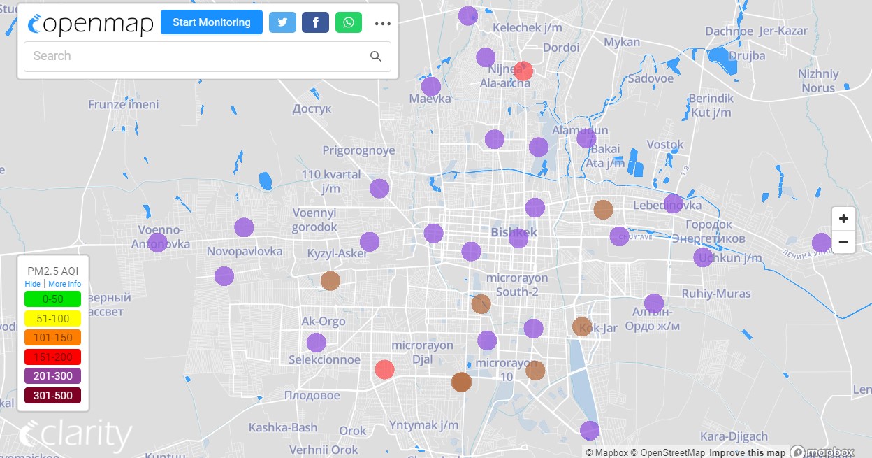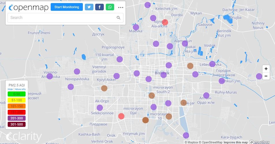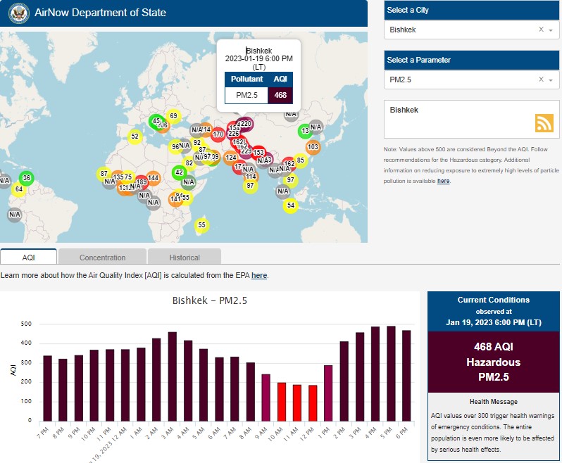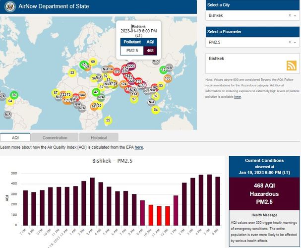 Посольство США в Кыргызстане также установило станцию. Информация обновляется каждый час. Индекс качества воздуха в районе дипломатической миссии «опасный» — 468 (AQI).