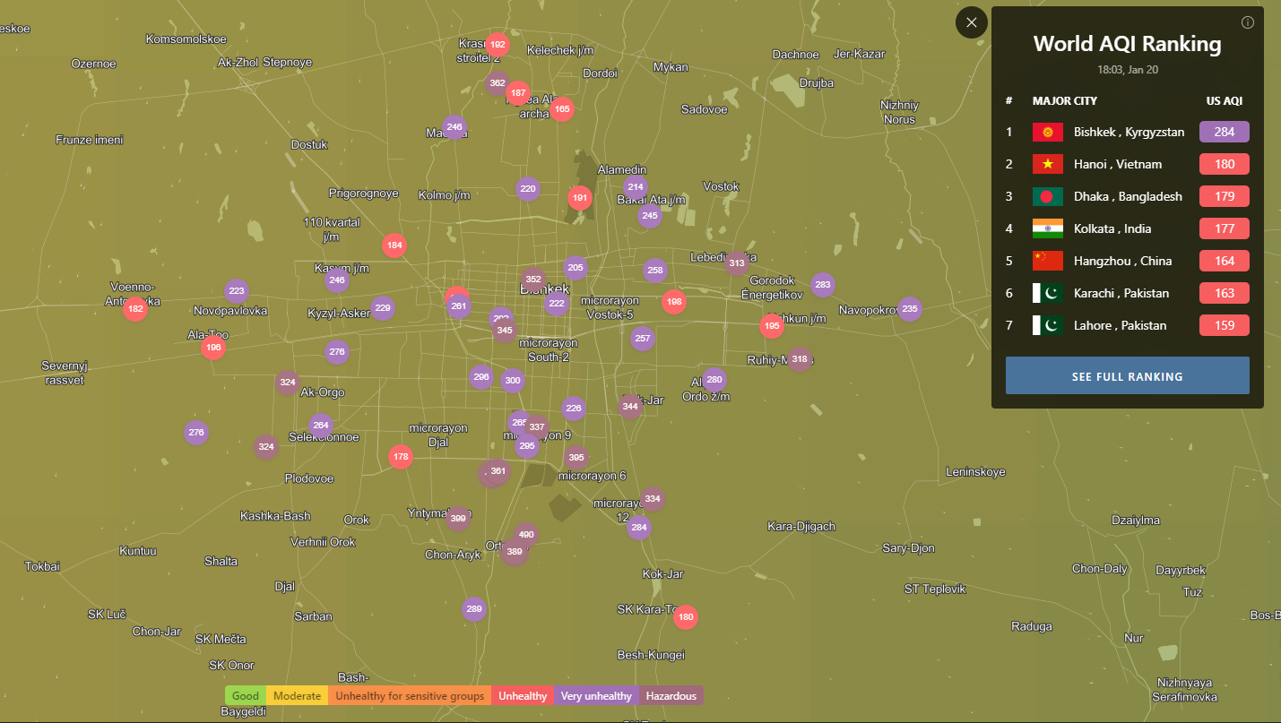В рейтинге крупнейших городов мира по качеству воздуха World Air Quality Бишкек остается на первом месте.