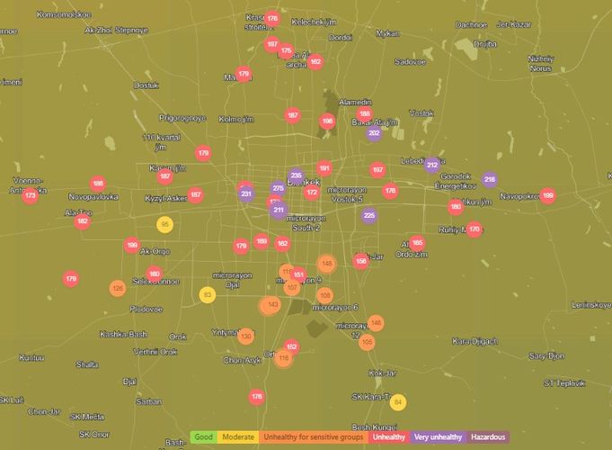 Посольство США в Кыргызстане также установило станцию. Информация обновляется каждый час. Индекс качества воздуха в районе дипломатической миссии «нездоровый» — 161 (AQI).