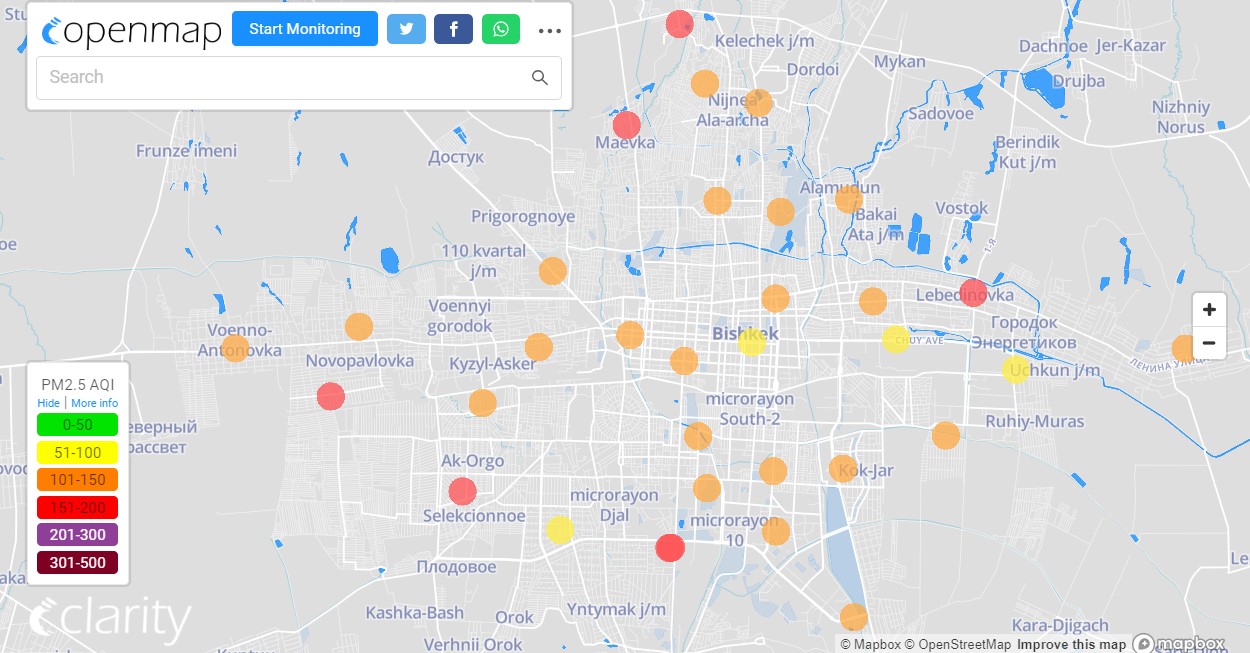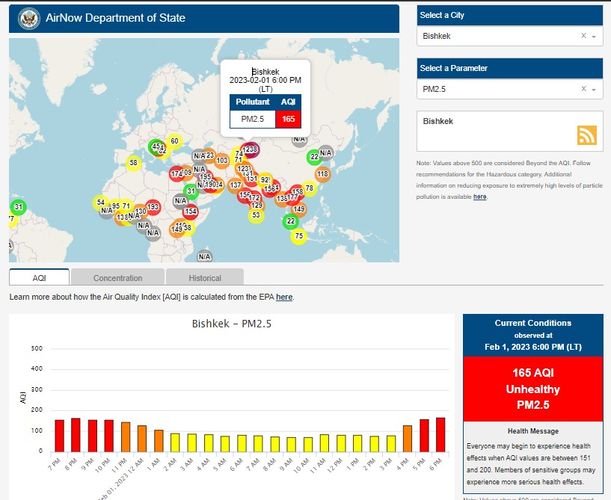 Посольство США в Кыргызстане также установило станцию. Информация обновляется каждый час. Индекс качества воздуха в районе дипломатической миссии «нездоровый» — 165 (AQI).