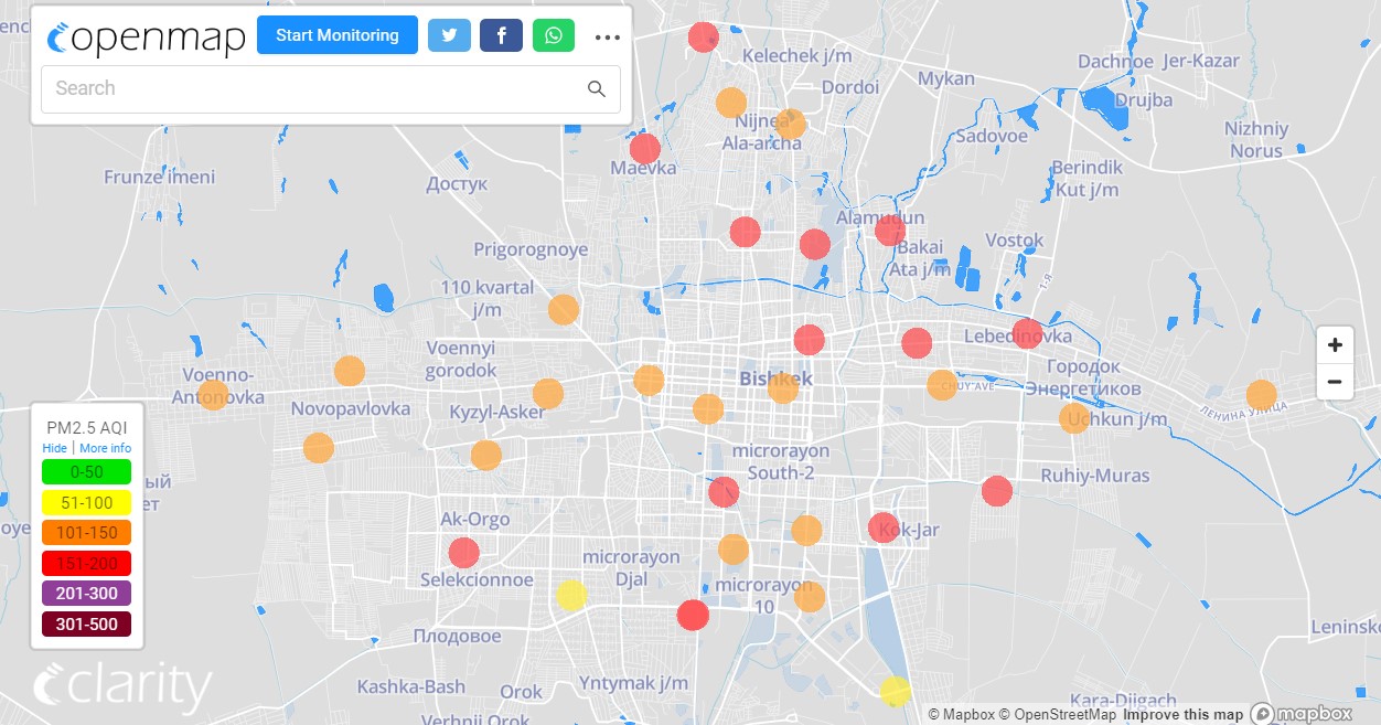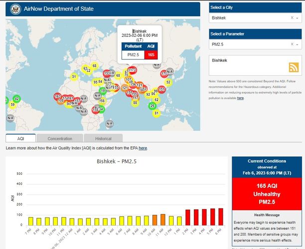 Посольство США в Кыргызстане также установило станцию. Информация обновляется каждый час. Индекс качества воздуха в районе дипломатической миссии «нездоровый» — 165 (AQI).