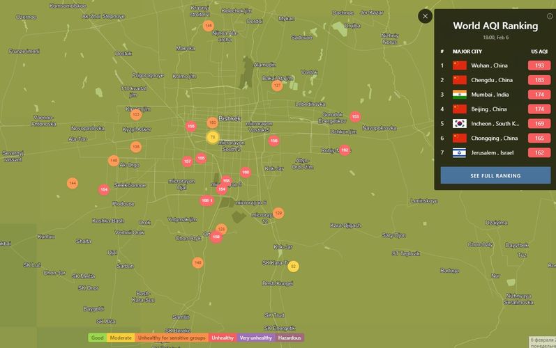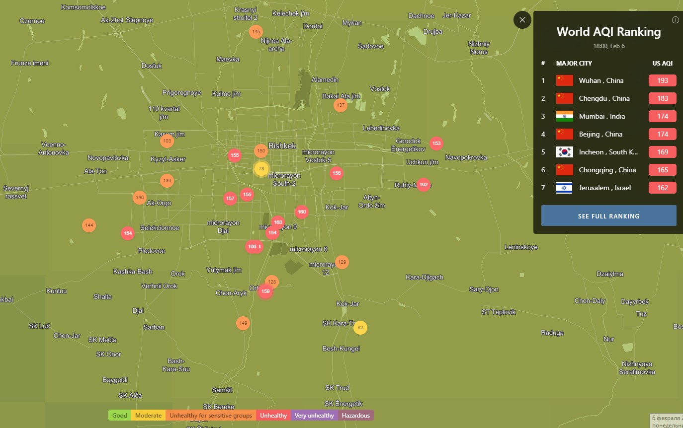 В рейтинге крупнейших городов мира по качеству воздуха World Air Quality Бишкек находится на 12-м месте.