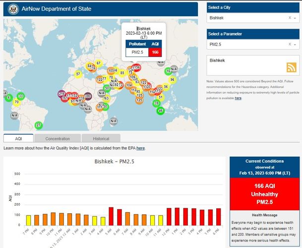 Посольство США в Кыргызстане также установило станцию. Информация обновляется каждый час. Индекс качества воздуха в районе дипломатической миссии «нездоровый» — 166 (AQI).