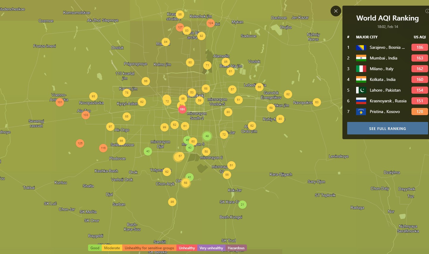 В рейтинге крупнейших городов мира по качеству воздуха World Air Quality Бишкек опустился на 54-е место.