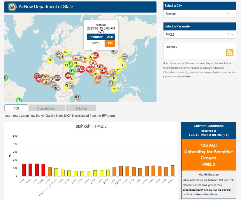 Посольство США в Кыргызстане также установило станцию. Информация обновляется каждый час. Индекс качества воздуха в районе дипломатической миссии «нездоровый для чувствительных групп» —136 (AQI).