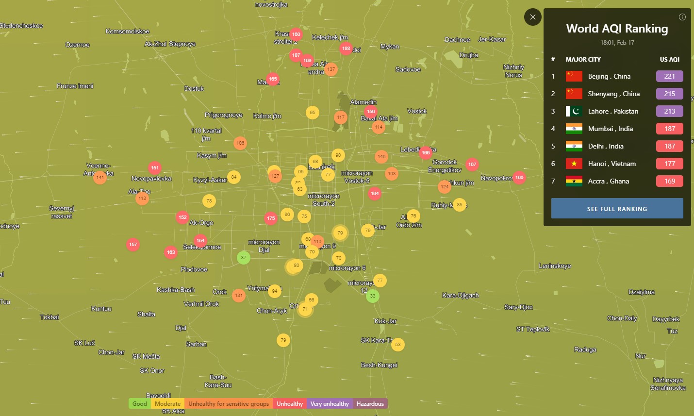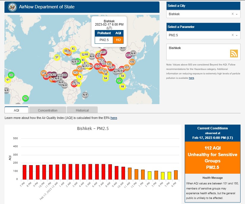 Посольство США в Кыргызстане также установило станцию. Информация обновляется каждый час. Индекс качества воздуха в районе дипломатической миссии «нездоровый для чувствительных групп» — 112 (AQI).