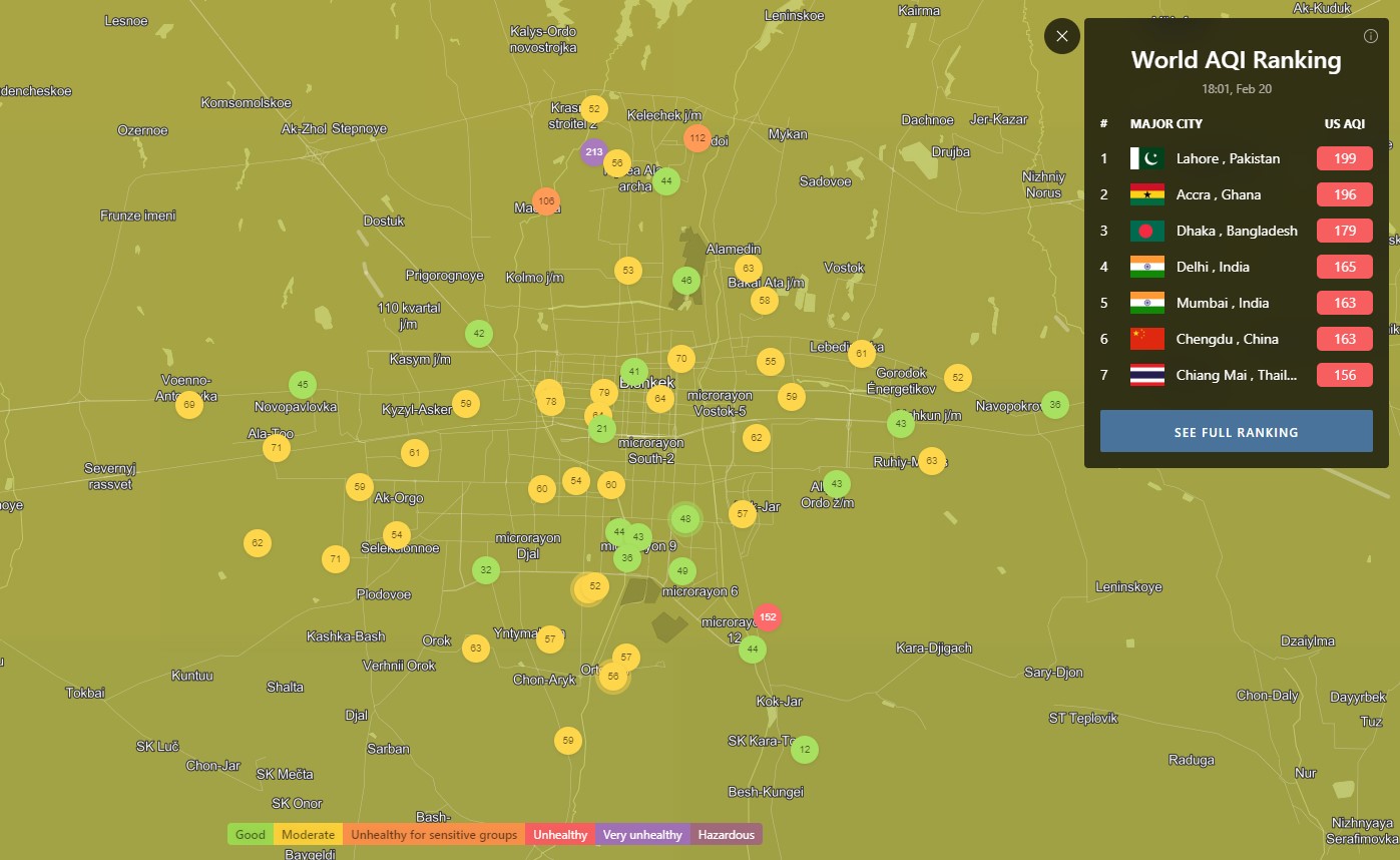 В рейтинге крупнейших городов мира по качеству воздуха World Air Quality Бишкек опустился на 45-е место.
