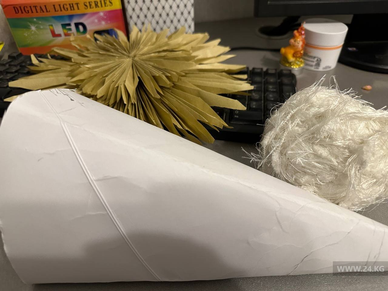 Елочку тоже можно сделать своими руками. Даже если у вас стоит в одной комнате большая лесная красавица, сделайте несколько маленьких для остальных комнат или офиса. Быстрее всего елку сделать из мишуры. Делаем конус из бумаги и обматываем его. Пять минут, и елка готова. Справится даже маленький ребенок.