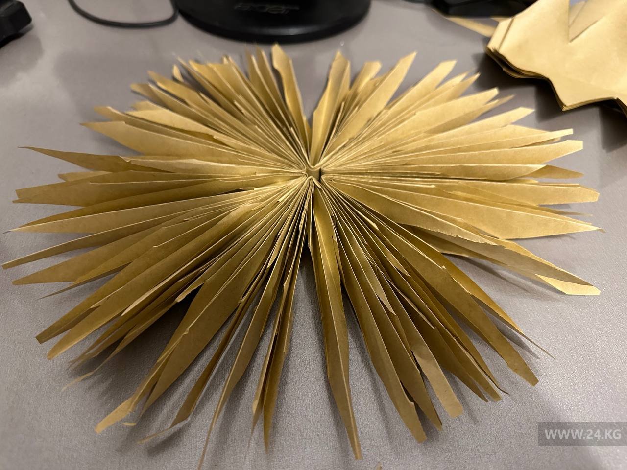 По тому же принципу сделали снежинки из упаковочной бумаги. Она более прочная. При желании можно сделать несколько таких, соединить между собой — и получится гирлянда.