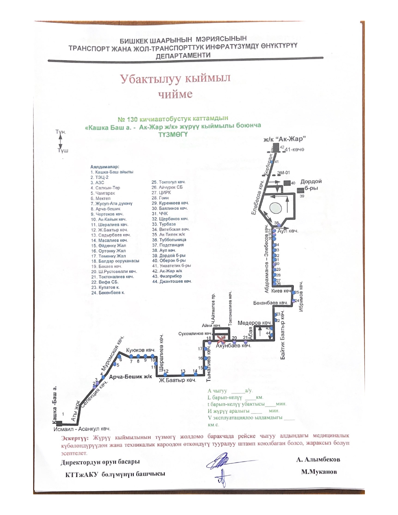 - № 130 — по проспекту Айтматова, улицам Айни (Сухомлинова) и Токтоналиева;