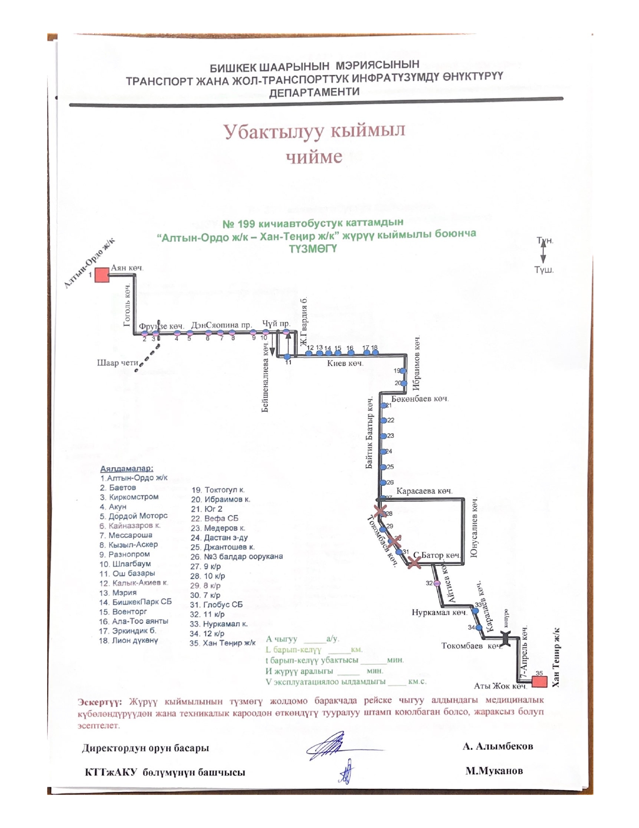 - № 199 — по улицам Сухэ-Батора, Юнусалиева и Карасаева;