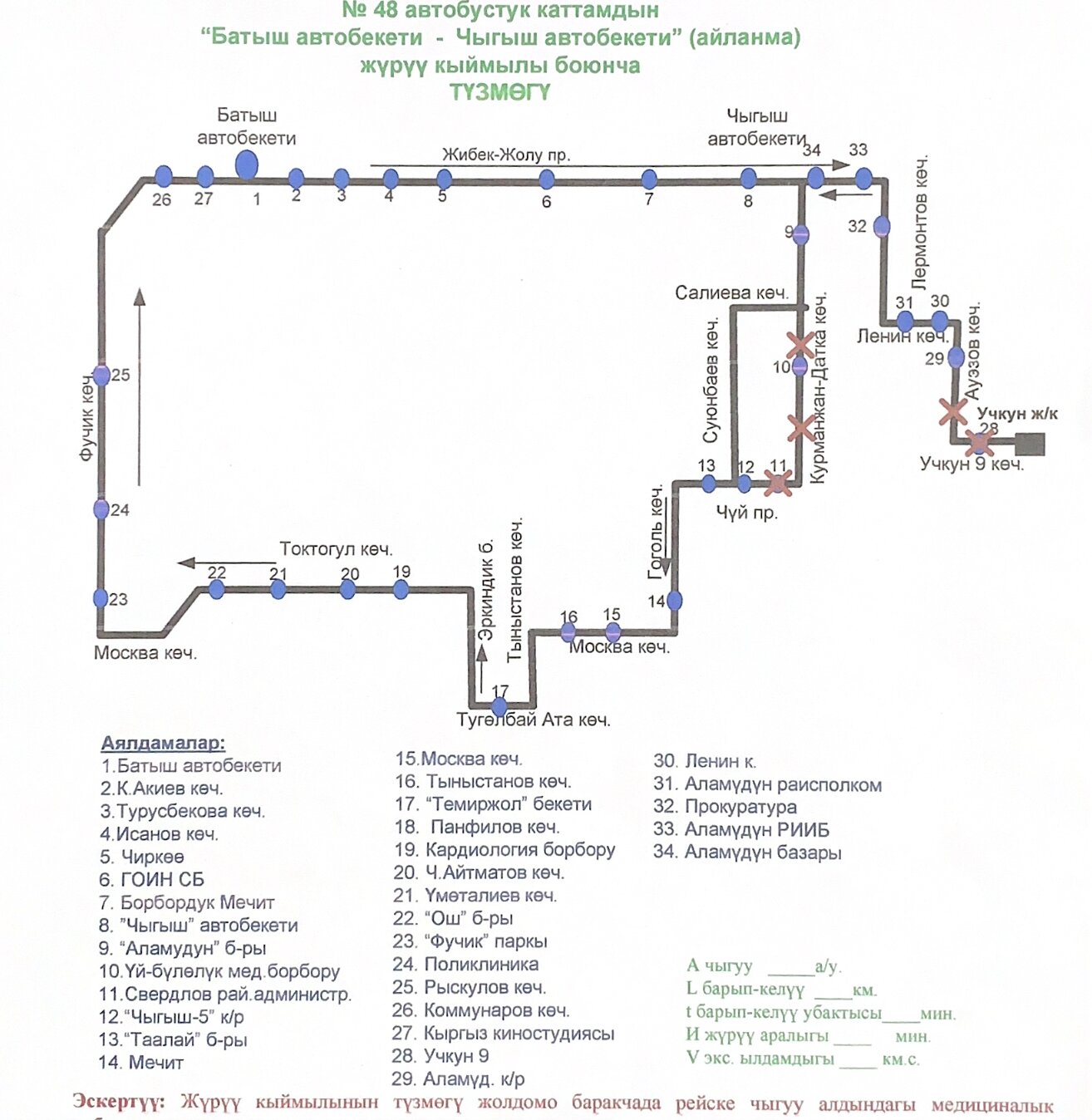 - автобусный маршрут № 34 будет следовать по маршруту: улица Курманджан Датки — проспект Жибек Жолу — улица Ибраимова — проспект Чуй;
