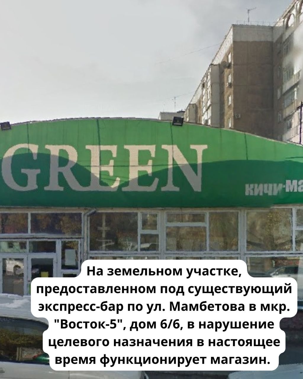- На участке, предоставленном под существующий экспресс-бар на улице Мамбетова в микрорайоне «Восток-5», дом № 6/6, в нарушение целевого назначения работает магазин.