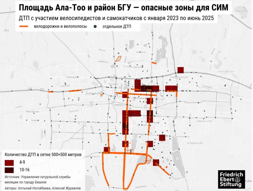 Городские исследователи Алексей Журавлев и Алтынай Ногойбаева проанализировали велоинфраструктуру Бишкека. По их данным, общая протяженность велосети столицы составляет около 46 километров, хотя официальная статистика мэрии варьируется от 47 до 100 километров.