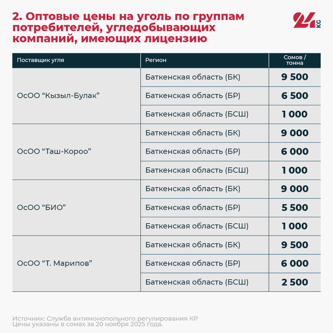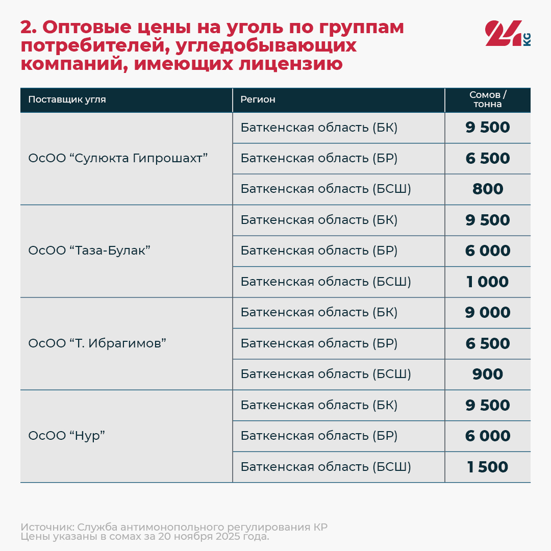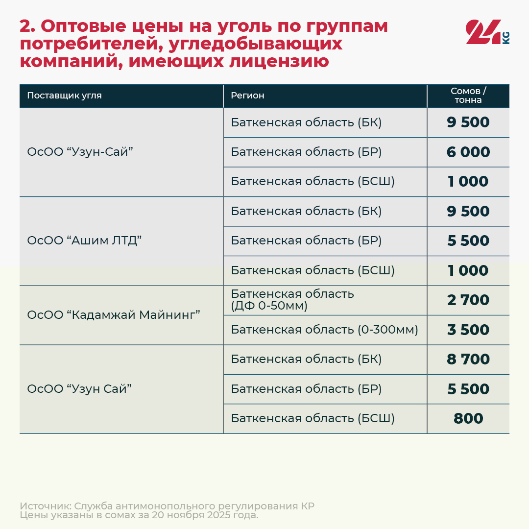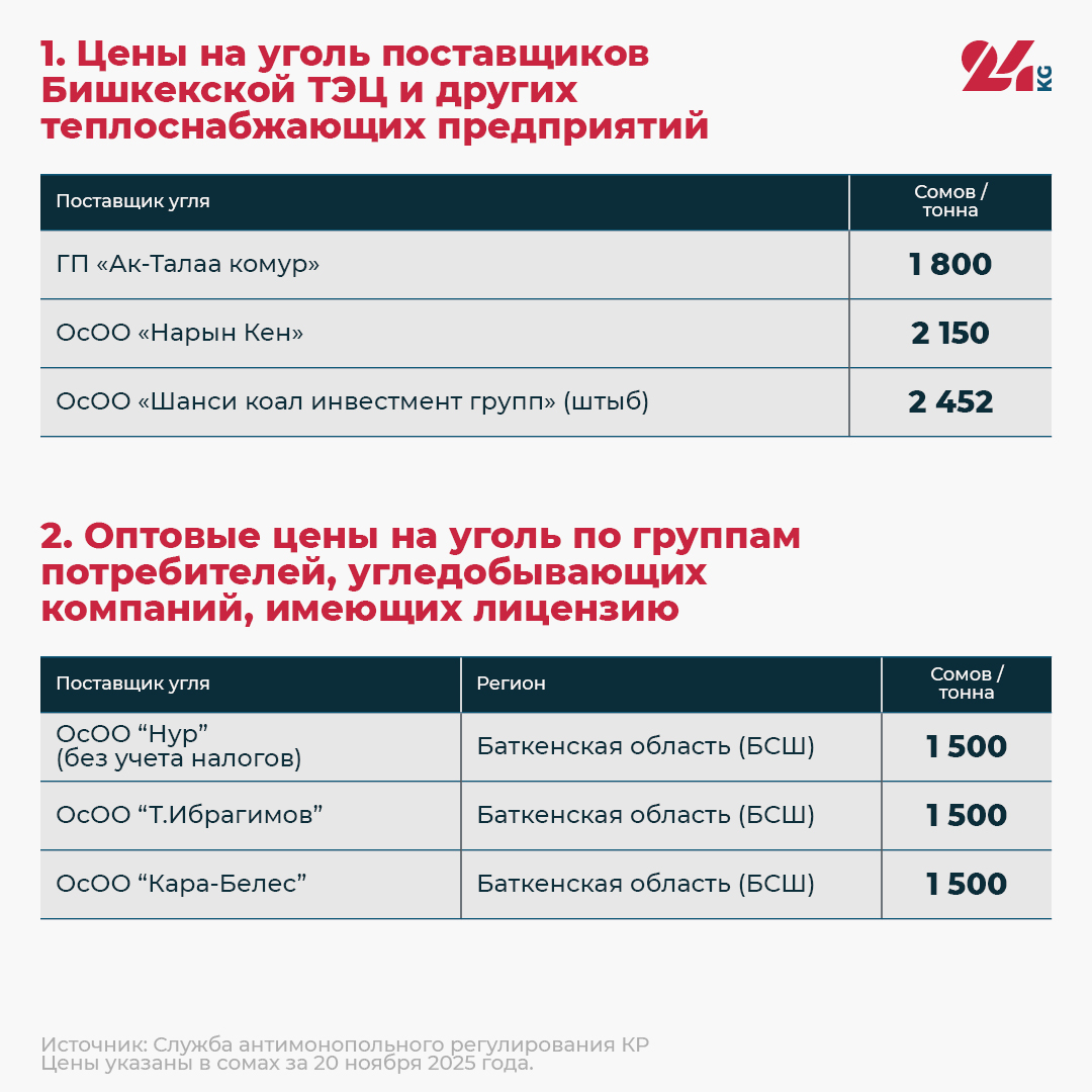 Согласно решению, цены на уголь для угледобывающих компаний, поставляющих топливо на МП «Бишкек ТЭЦ» и другие теплоснабжающие предприятия, установлены с учетом НДС и НСП: