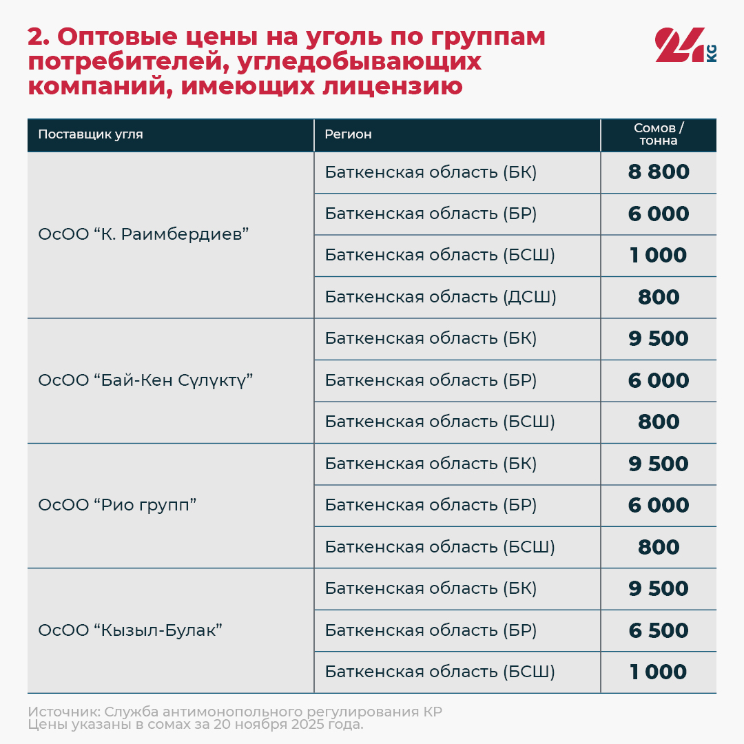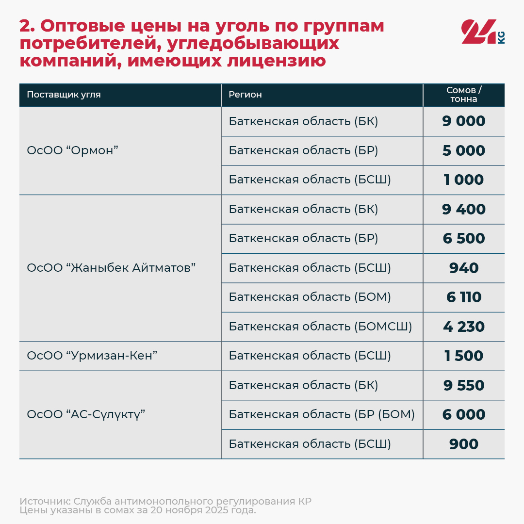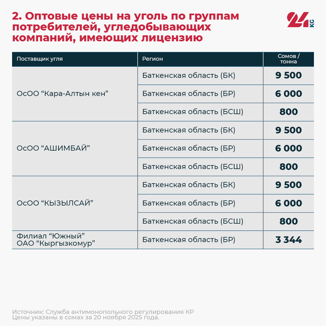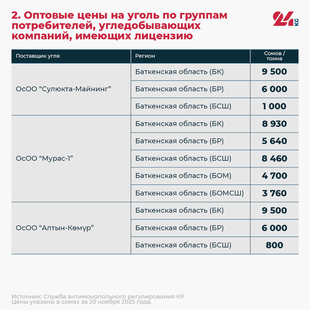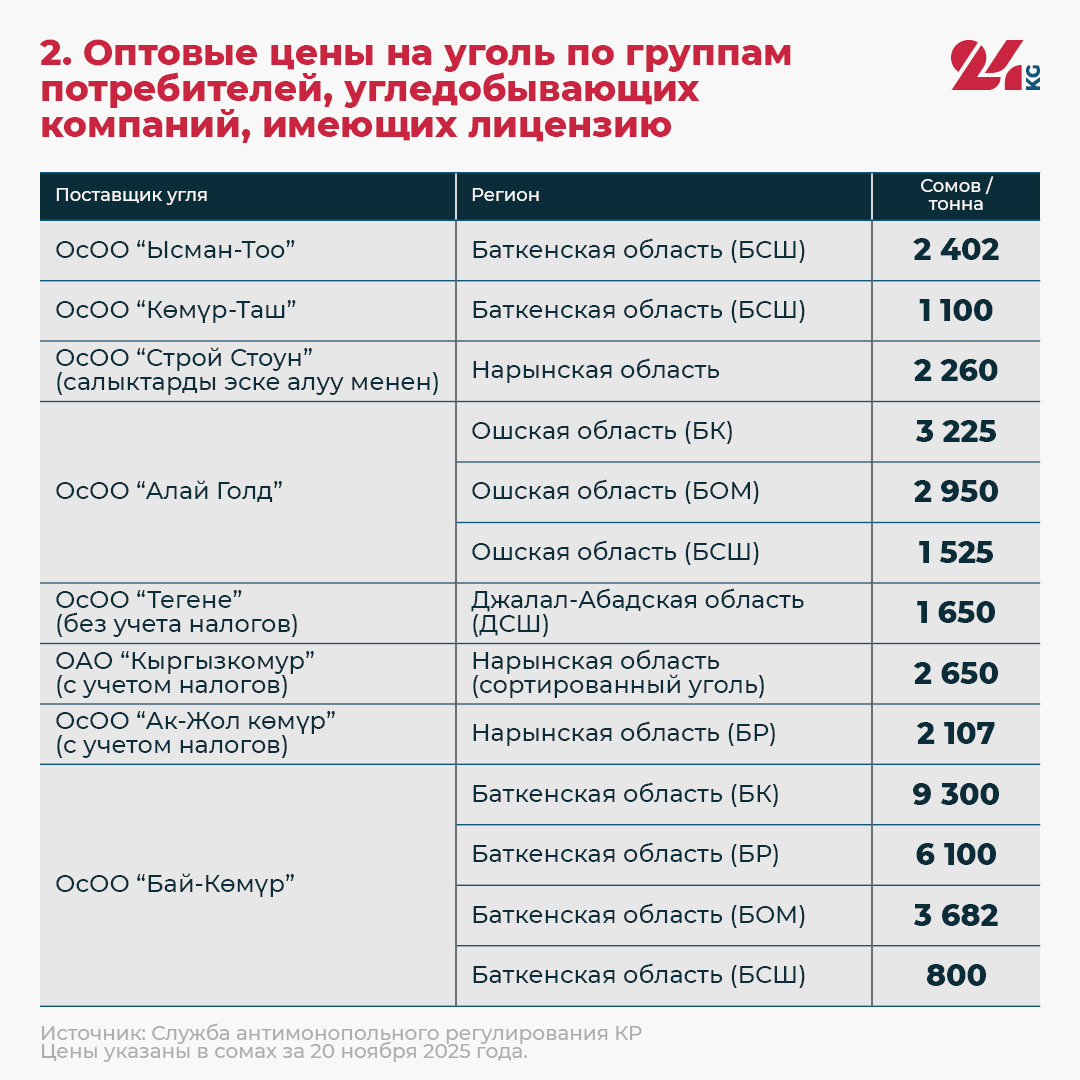 Согласно решению, цены на уголь для угледобывающих компаний, поставляющих топливо на МП «Бишкек ТЭЦ» и другие теплоснабжающие предприятия, установлены с учетом НДС и НСП: