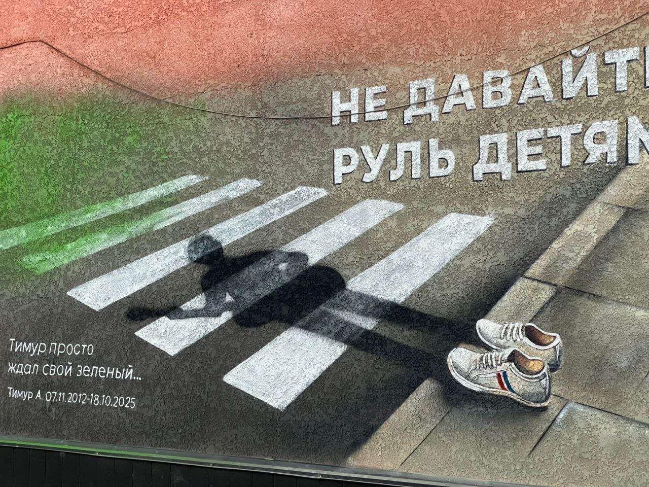 «Мы вчера закончили мурал очень социально значимый, трагичный, посвященный Тимуру, который погиб на светофоре под колесами машины, управляемой несовершеннолетним. Этот мурал инициирован родителями, поддержан школой, а самое главное — людьми. Я обсуждал с ними эскиз, спрашивал их мнение, в общем, подошел к этой теме очень серьезно, так как она весьма острая», — рассказал художник.