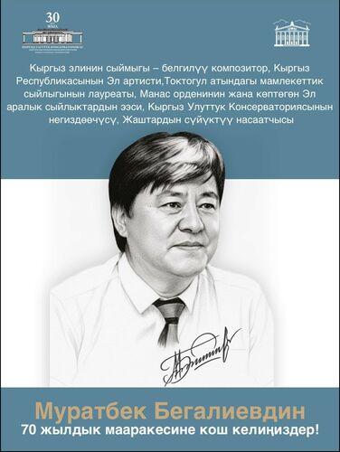 Муратбек Бегалиев — признанный лидер современной композиторской школы Кыргызстана. Его творчество отличается содержательной глубиной и оригинальностью связей национального фольклора с современной стилистикой. М. Бегалиев – автор музыки к 30 фильмам и 20 спектаклям. то