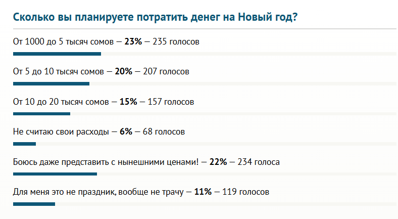 Согласно результатам голосования, 23 процента респондентов планируют выделить из бюджета до 5 тысяч сомов, 20 процентов — от 5 тысяч до 10 тысяч. Еще 15 процентов участников опроса могут потратить от 10 до 20 тысяч сомов.