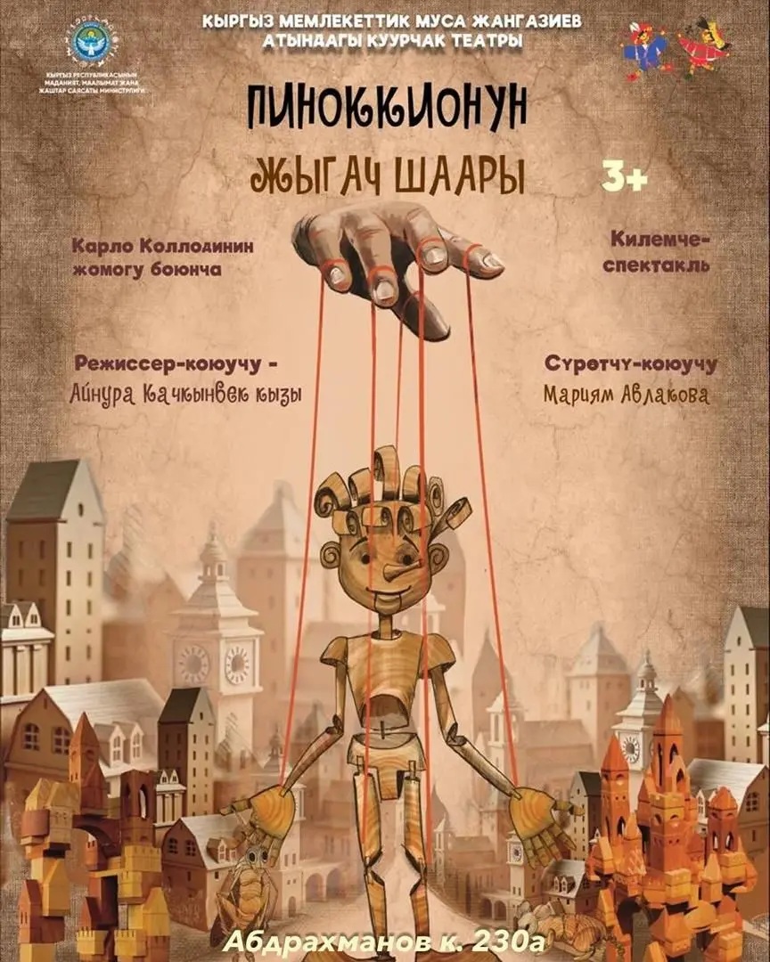 Кыргызский государственный театр кукол имени М. Жангазиева также представляет 31 января по мотивам сказки Карло Коллоди спектакль «Приключения деревянного мальчика».