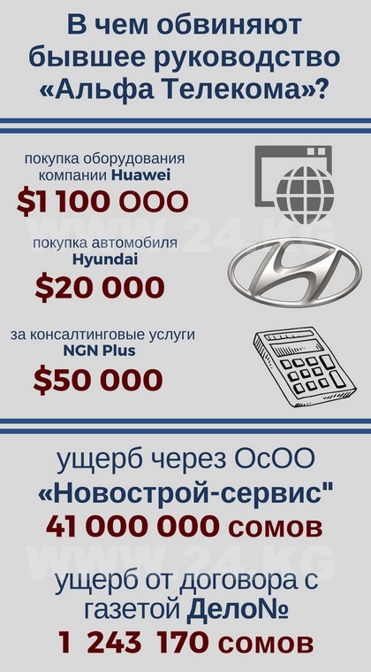 По версии следствия, подсудимые Алмазбек Абеков, Азамат Мурзалиев и Аман уулу Кенжебек, работая на руководящих должностях в компании ЗАО «Альфа Телеком», вступили между собой в преступный сговор для получения незаконной материальной выгоды.