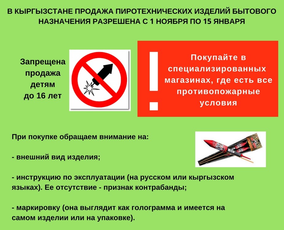 Главный инспектор Управления пожарного надзора Госэкотехинспекции Улан Уралиев рассказал, что при использовании пиротехнических изделий следует соблюдать элементарные правила безопасности: держать изделия подальше от пожароопасных мест и внимательно читать инструкцию по их эксплуатации.