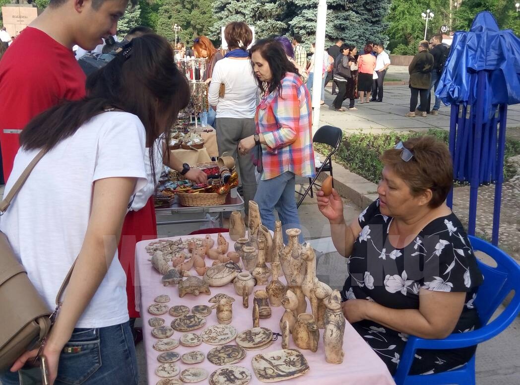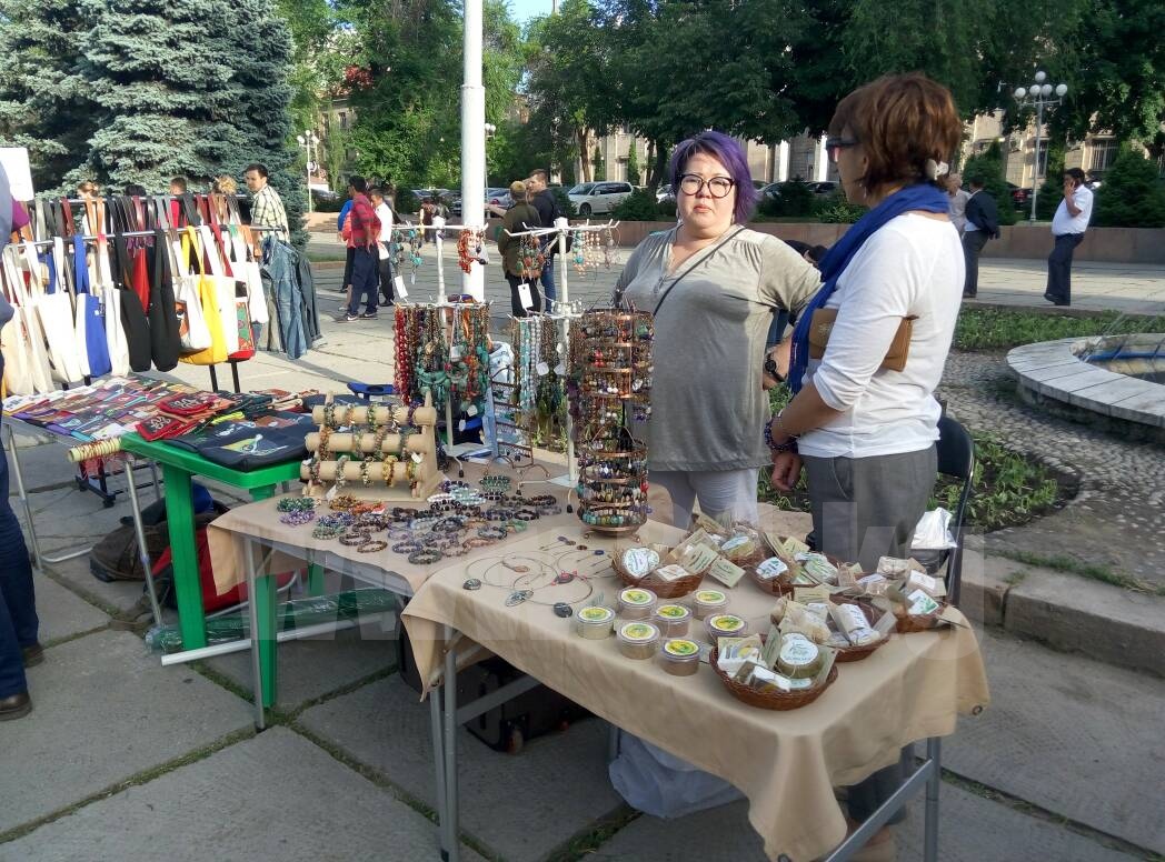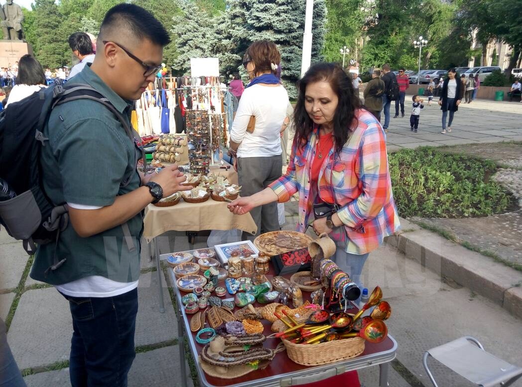 Послушать композиции пришли несколько десятков горожан. Для пожилых или людей с маленькими детьми организаторы предусмотрительно поставили стулья. Рядом проходит ярмарка изделий отечественных ремесленников.