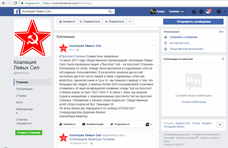 Общественная организация «Коалиция Левых Сил» приступила к сбору подписей за переименование в Бишкеке проспекта Чуй в проспект Сталина. Об этом сообщается на официальной странице организации в Facebook.