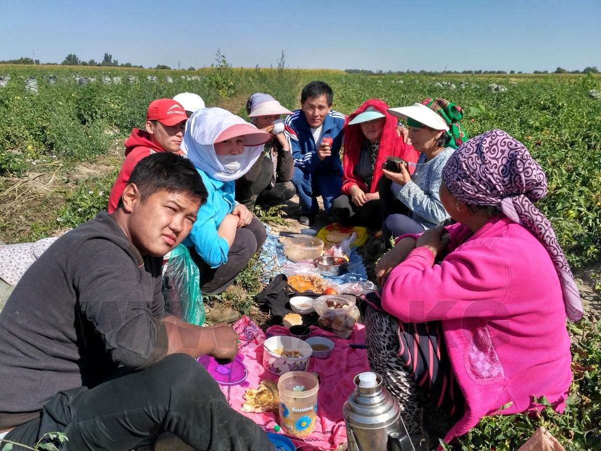 Время близится к 11. Обед. На поле меж рядов помидоров в кружок уселись несколько женщин и подростков. У всех загорелые под палящим солнцем лица и руки. В центре устроили импровизированный дастархан. На полевой скатерти все продукты в целлофановых пакетах, люди принесли их из дому.