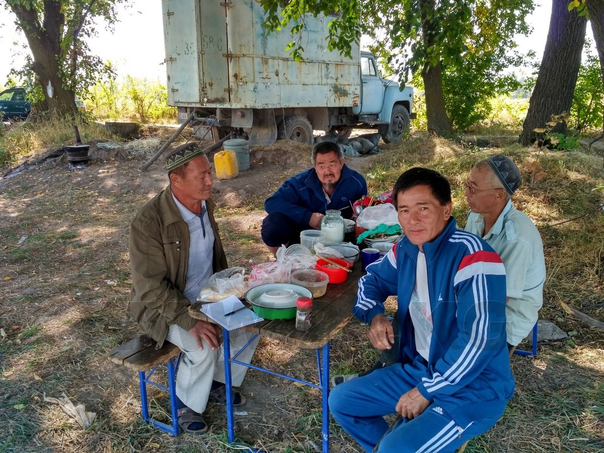 Ближе к часу дня мужчины собрались за обеденным столом. Несмотря на полевые условия и чисто мужскую компанию, стол не скудный. Лапша к лагману, салаты, хлеб, специи, чай, сахар, мясо... На поле Миша руководит процессом не один, вместе с ним еще несколько мужчин. В основном родственники. Кто близкий, кто дальний – и все они его помощники.