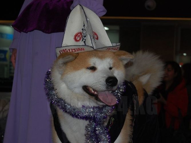 Фото ИА «24-kg.com». Пес японской породы акита-ину в национальном кыргызском костюме. Бишкек, 2017 год