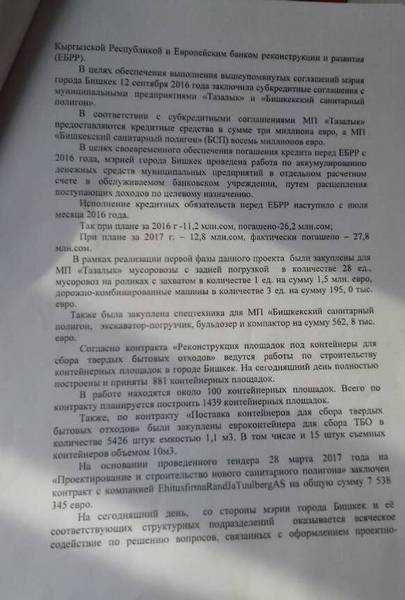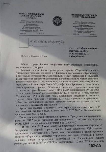 В мэрии Бишкека ИА «24-kg.com» рассказали, на что потратили грантовые и кредитные средства Европейского банка реконструкции и развития (ЕБРР). Чиновники прислали еще одно письмо в ответ на публикацию «Завод по переработке мусора под вопросом. Мэрия бойкотирует 22 миллиона от ЕБРР».