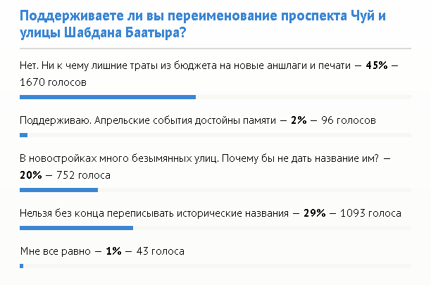ИА «24-kg.com» поинтересовалось у читателей, поддерживают ли они инициативу чиновников. Почти половина выступила против, посчитав излишними траты из бюджета на новые аншлаги. Еще 29 процентов отметили, что нельзя без конца переписывать исторические названия. 20 процентов проголосовавших выступили за наименование безымянных улиц в новостройках. И лишь два процента поддержали идею.