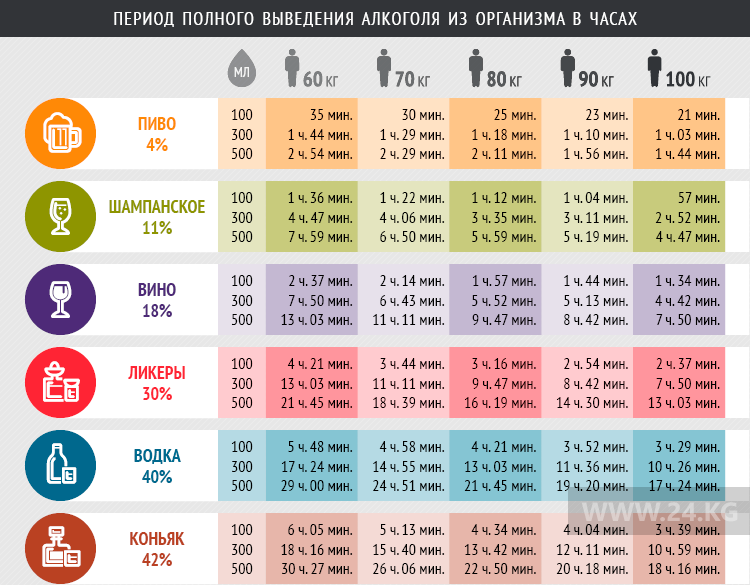 На это влияют вес, возраст, пол, количество и качество выпитого. Необходимо учитывать состояние здоровья, работу почек и печени. В женском организме алкоголь держится дольше.