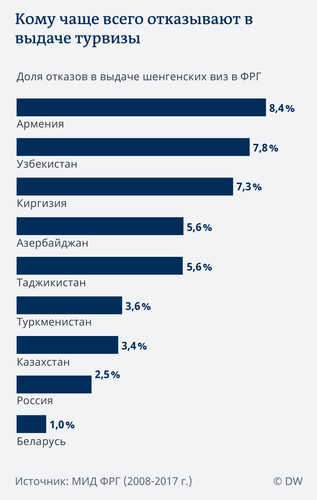 Согласно статистике МИД ФРГ, отдыхать в Германию чаще всего ездят граждане России. За период с 2008 по 2017 год россияне подали свыше 3,5 миллиона заявлений на оформление немецких турвиз. За ними следуют граждане Беларуси и Казахстана — 635 тысяч и 367 тысяч запросов соответственно. Им же реже всего отказывают в выдаче визы.