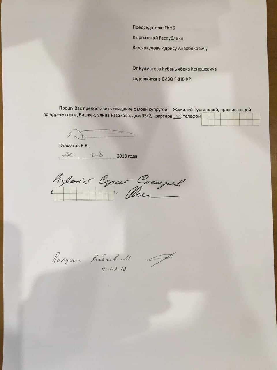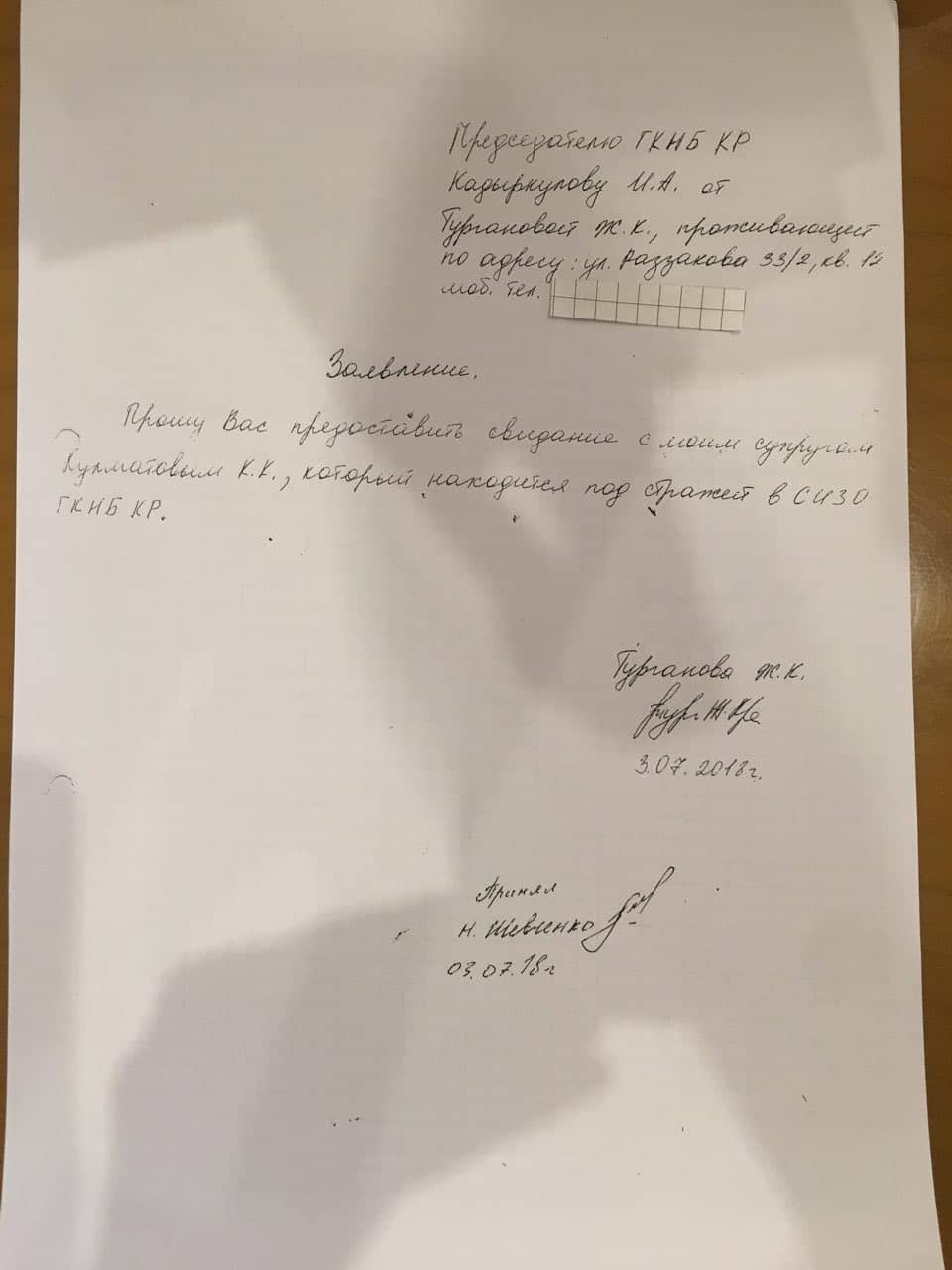 Супруга Кубанычбека Кулматова семь раз обращалась к председателю ГКНБ Идрису Кадыркулову с просьбой о свидании с мужем. Об этом Жамиля Кулматова сообщила 24-kg.com.