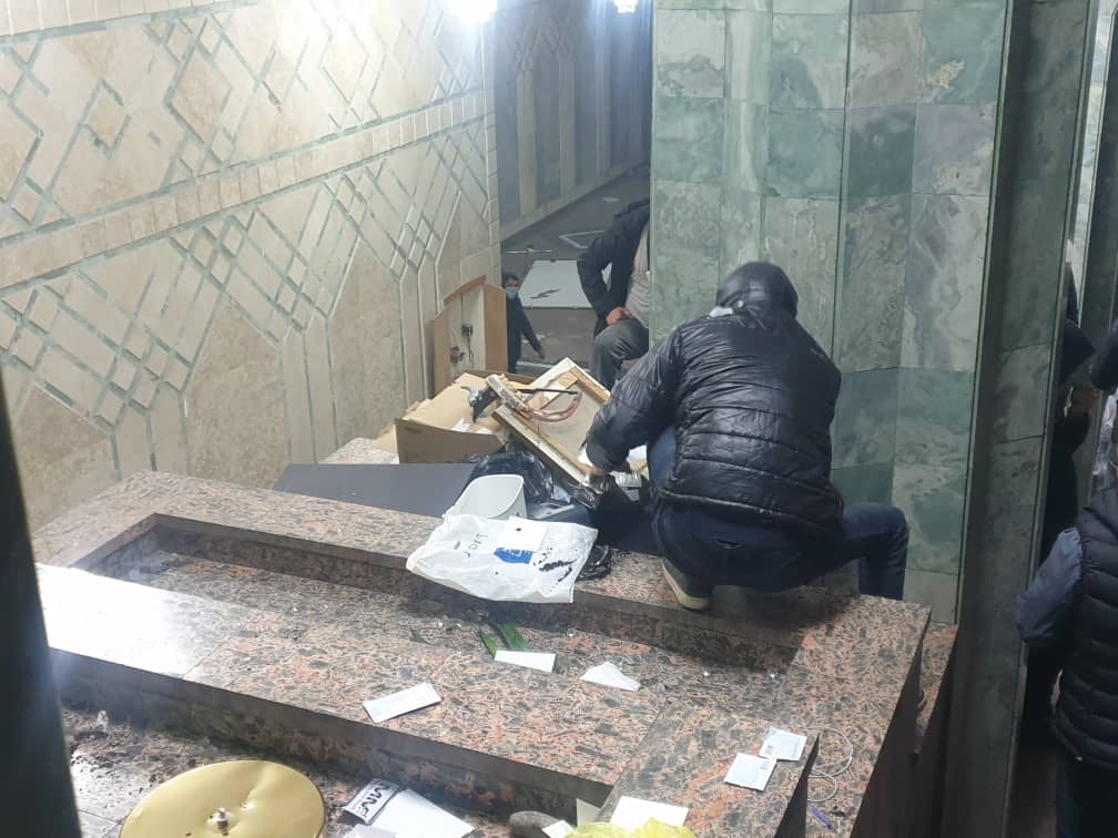 У входа в «Белый дом» стоят несколько активистов, которые пытаются не допустить мародерств, однако участники акции протеста их отодвигают в сторону и выходят с награбленным.