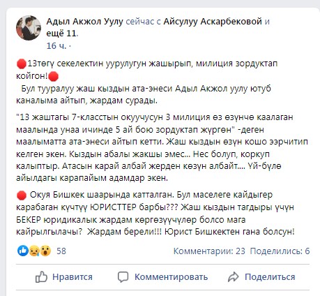 Пользователь Facebook Адыл Акжол уулу написал на своей странице, что 13-летнюю девочку, ученицу 7-го класса, якобы насиловали трое милиционеров.