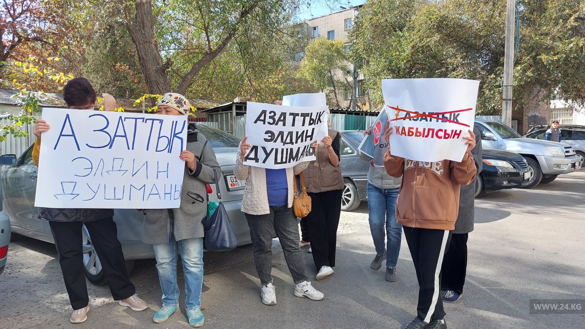 У здания, где расположена редакция Радио «Азаттык» в Бишкеке, проходит митинг. На акцию протеста собралось около 20 человек.