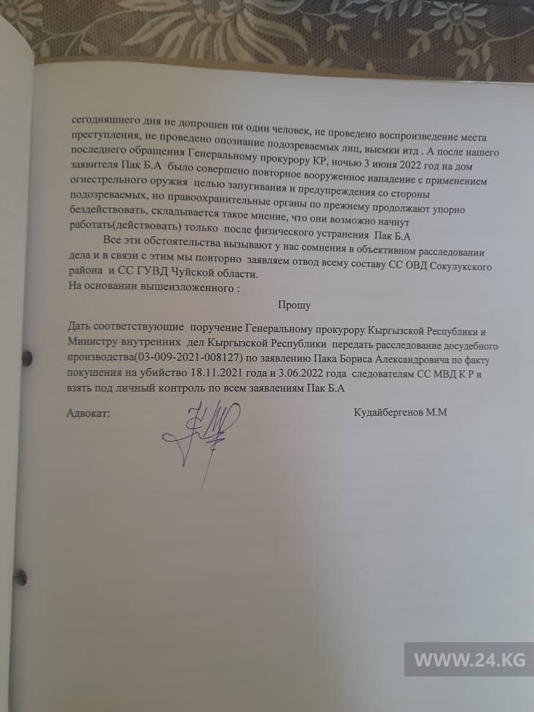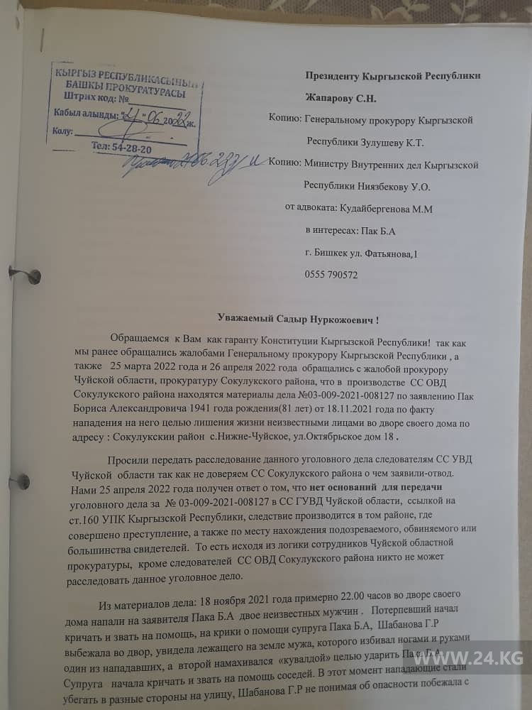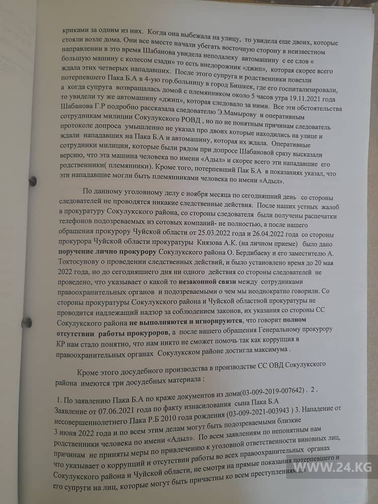 По фактам изнасилования мальчика и нападения на отца юрист обращался к президенту Садыру Жапарову, генпрокурору Курманкулу Зулушеву и омбудсмену Атыр Абдрахматовой с просьбой оказать содействие. Однако сдвига в уголовном деле нет.