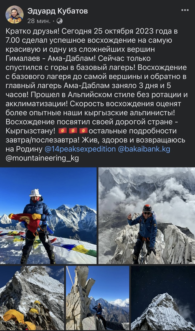Президент Федерации альпинизма и скалолазания Кыргызстана Эдуард Кубатов покорил одну из сложнейших вершин Гималаев — Ама-Даблам. Об этом он сообщил в соцсетях.
