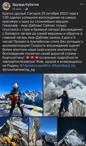 «Прошел в альпийском стиле без ротации и акклиматизации. Скорость восхождения оценят более опытные наши кыргызские альпинисты. Восхождение посвятил своей дорогой стране — Кыргызстану», — написал он.